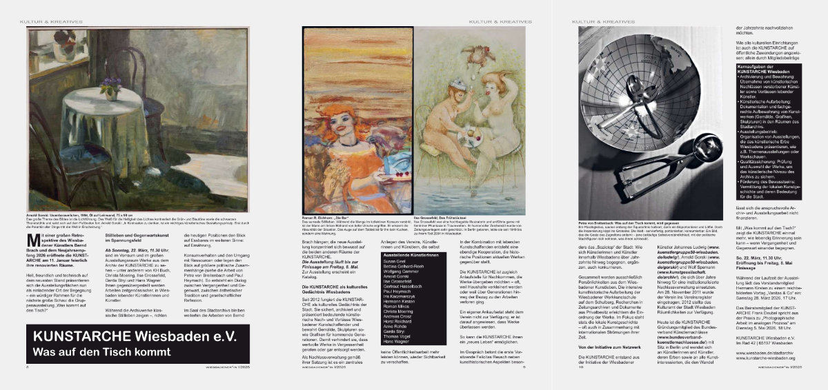 Mit einer großen Retrospektive des Wiesbadener Künstlers Bernd Brach und dem Neujahrsempfang 2026 eröffnete die KUNSTARCHE am 11. Januar feierlich ihre renovierten Räume. Hell, freundlich und technisch auf dem neuesten Stand präsentieren sich die Ausstellungsflächen nun als einladender Ort der Begegnung – ein würdiger Rahmen für die nächste große Schau: die Gruppenausstellung „Was kommt auf den Tisch?“